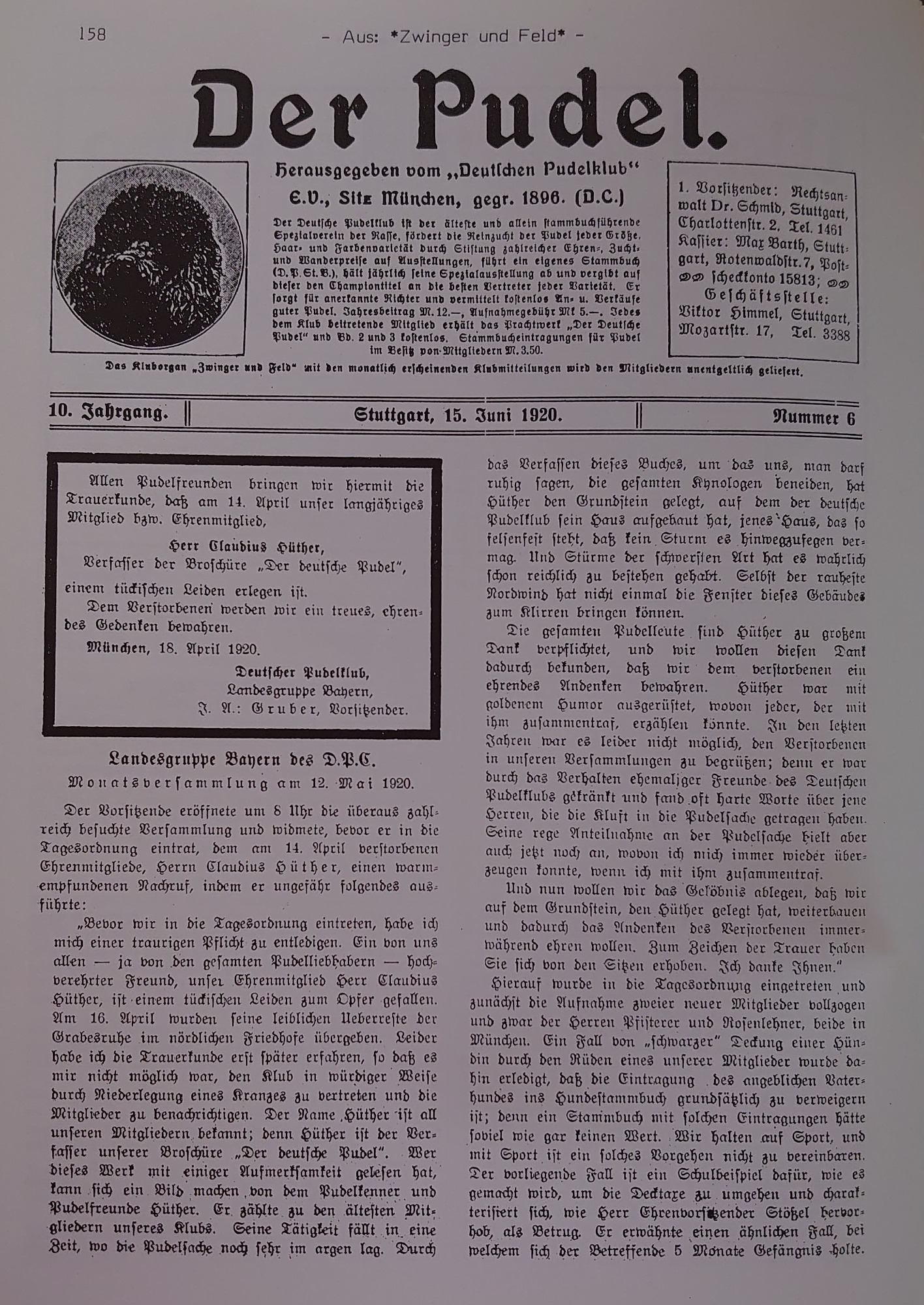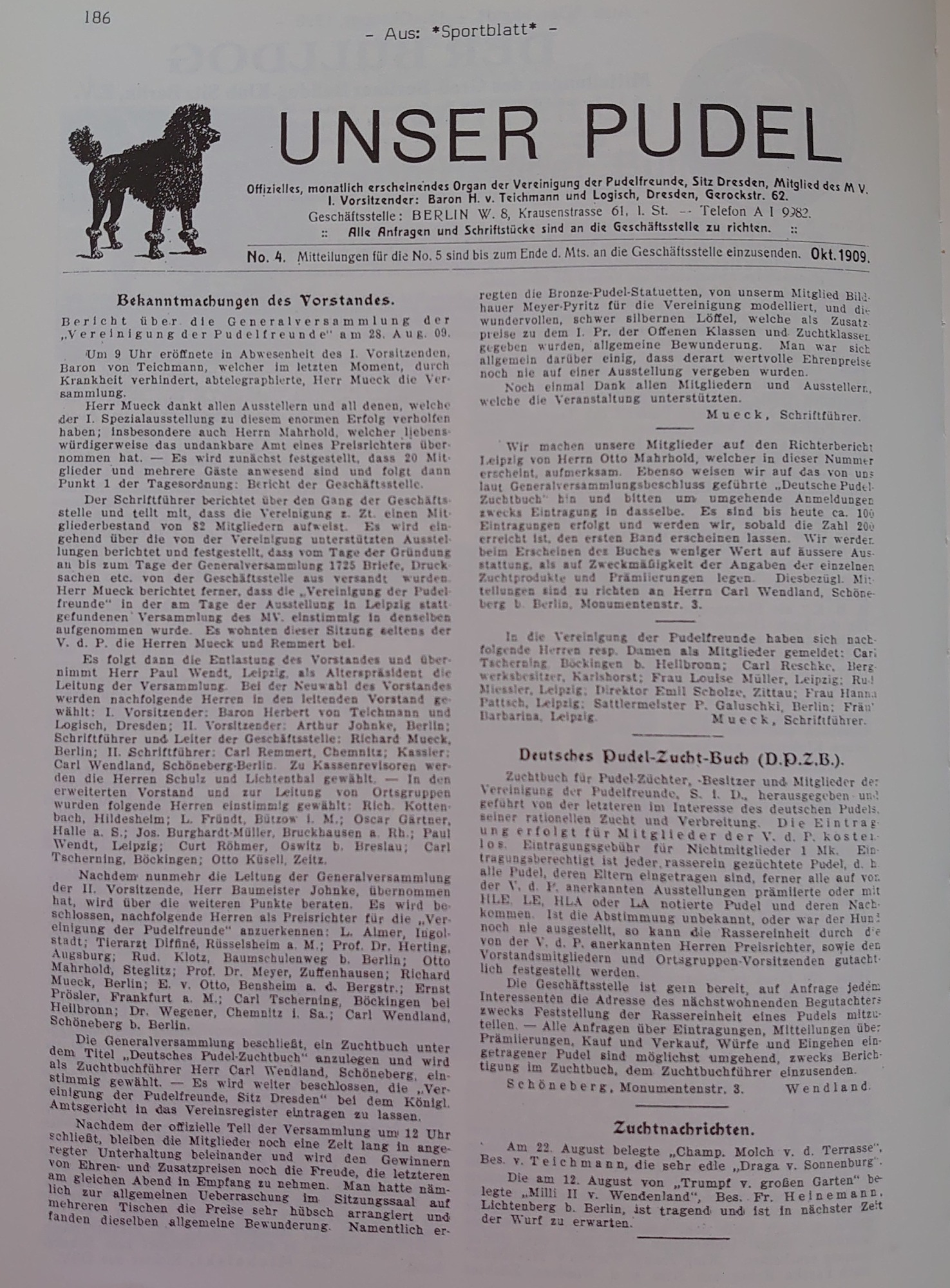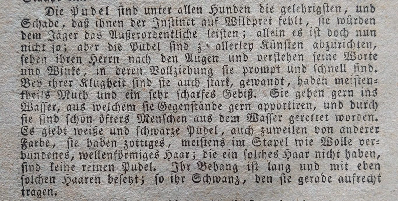 In einem kleinen Büchlein "Zucht der Hunde" aus dem Jahre 1831 ist der Großpudel unter der Rubrik Stubenhunde erwähnt.